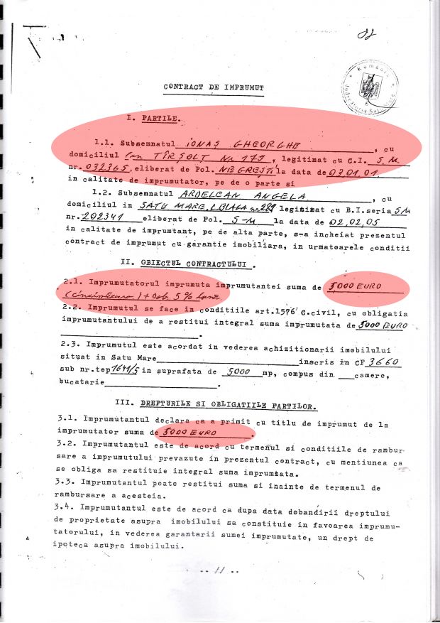 Incercand sa arate ce caracter au acuzatorii sai, preotul a depus la dosar un „Contract de imprumut”, in care partile sunt Ionas Gheorghe, acuzatorul lui si Angela Ardelean, in fapt sotia verisorului sau, Danut Ardelean, de asemenea tepuit bine de preotul camatar.