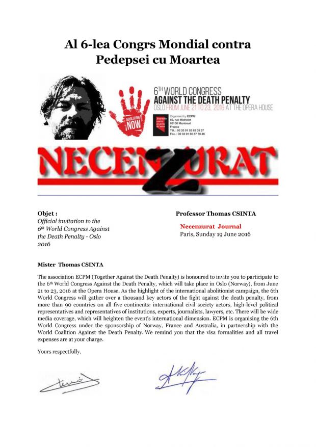 In ciuda participarii unui numar impresionant de personalitati remarcabile ale vietii politice internationale, ale organizatiilor nationale (internationale) pentru apararea drepturilor omului, oameni de stiinta, laureati al Premiului Nobel pentru Pace, in ciuda faptului ca romanul Ionut-Alexandru Gologan, condamnat la moarte in Malaezia isi asteapta executia in Culoarul mortii, nicio personalitate politica romana sau persoana juridica (organziatie care militeaza pentru drepturile omului) inregistrata in Romania, nu a considerat utila participarea sa la acest al 6-lea Congres International contra Pedepsei cu Moartea (Oslo/21-23 iunie 2016).
