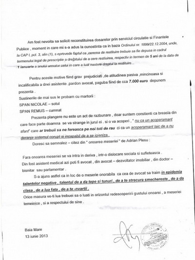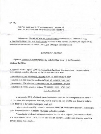 Si, atentie, pe finalul petitiei, tot ea isi manifesta cat se paote de clar neincrederea in deciziile Baroului Maramures.
