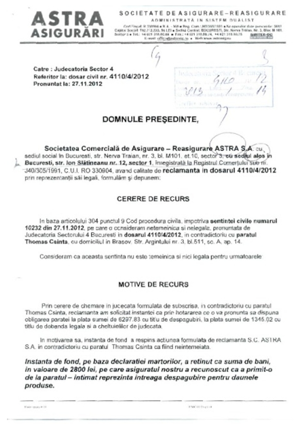In urma unei "Scrisori deschise", (publicata la “Dezvaluiri” in Ziarul "Necenzurat": cu titlul : “ASTRA ASIGURARI: Incompetenta, Coruptie, Complicitatea la insaleciune in banda organizata, Asociere de raufacatori si Favorizarea infractorului” http://www.necenzuratmm.ro/dezvaluiri/41597-astra-asigurari-incompetenta-coruptie-complicitate-la-inselaciune-in-banda-organizata-asociere-de-raufacatori-si-favorizarea-infractorului.html), adresata Presedintelui Completului de Judecata al Sectorului 4-Bucuresti, in Dosarul civil cu nr.4110/4/2012, pe data de 27.11.2012, prin sentinta cu nr. 10232 am castigat procesul cu SC. ASTRA Asigurari!