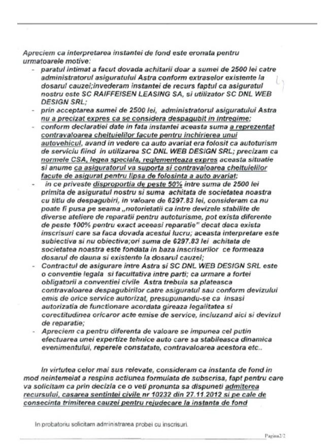 In plus, este bine cunoscut faptul ca in reparatia masinii, preturile au fost umflate de catre SC. ASTRA ASIGURARI, deci cea ceea ce sustin ele nu au nimic in comun cu realitatea.