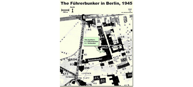 [2] Führerbunker-ul este numele uzual, utilizat pentru desemnarea unui complex de sali (spatii) subterane la Berlin, de unde Adolf Hitler ar fi coordonat o parte dintre atacurile Germaniei nazite in cadrul Puterilor Centrale, contra Puetrilor Aliate, in timpul celui de-al Doilea Razboi Mondial si unde s-a si siuncis la sfarsitul acestuia. Din cercetari de arhiva, rezulta ca acest Bunker ar fi fost al 13-lea si ultimul dintre Cartierele generale ale Führer-ului (Führerhauptquartiere). In realitate existau doua bunkere, legate intre ele prin intermediul unori scari dreptunghiulare (si nu in spirala cum sunt prezentate in unele documente!): Vorbunker-ul (cel vechi, construit in 1936), situat sub holul mare al Cancelariei (in spatele celei vechi) si Führerbunker-ul (cel recent, construit in 1943 de catre intreprinderea Hochtief in cadrul unei ample constructii berlineze inceput in 1940), situat la cca 8,2m sub gradina Neue Reichskanzlei (noua Cancelarie a Reich-ului) pe Wilhelmstraße N°77, (azi la cca 125m, la nord de Noua Cancelarie pe fosta Voßstraße N°6) ceva mai jos decat Vorbunker-ul si putin mai la vest (sau vest/sud-vest). Acest complex era protejat de catre o structura din beton masiv cu o grosime de cca 4 m si era impartita, pe doua nivele, in 30 de incaperi mici, prevazuta cu o iesire de urgenta catre gradina si alte cateva iesiri catre cladirile principale. Adolf Hitler ocupa in sectiunea noua o parte din camerele din fund, iar in februarie 1945, nu cu mult timp inainte de a se sinucidae, ele erau inca mobilate cu mobila de lux si obiecte de arta de mare valoare, sustrase sau recuperate din Cancelarie.