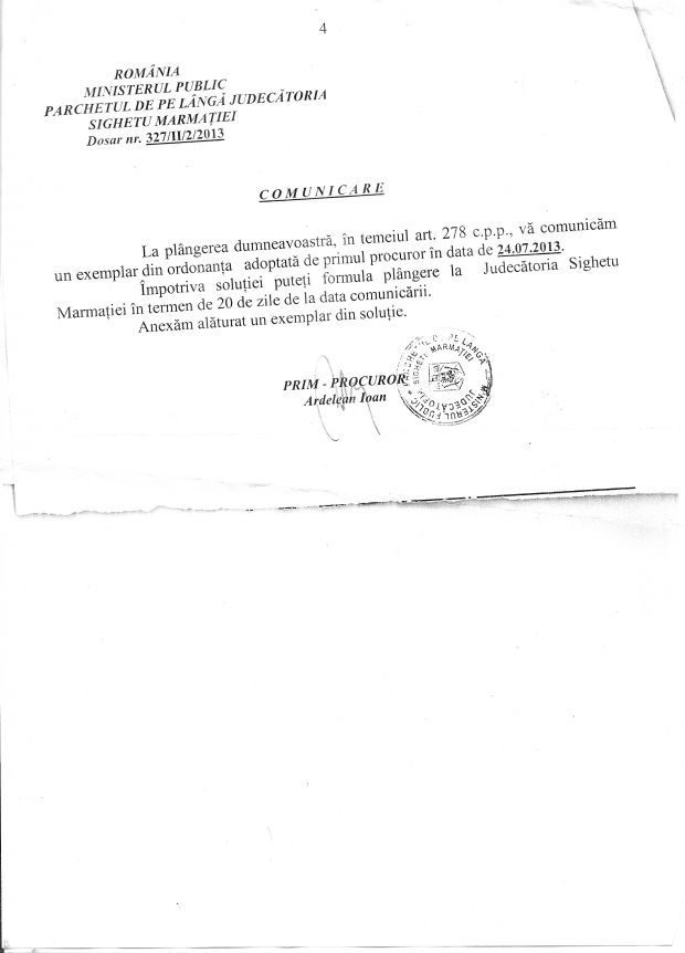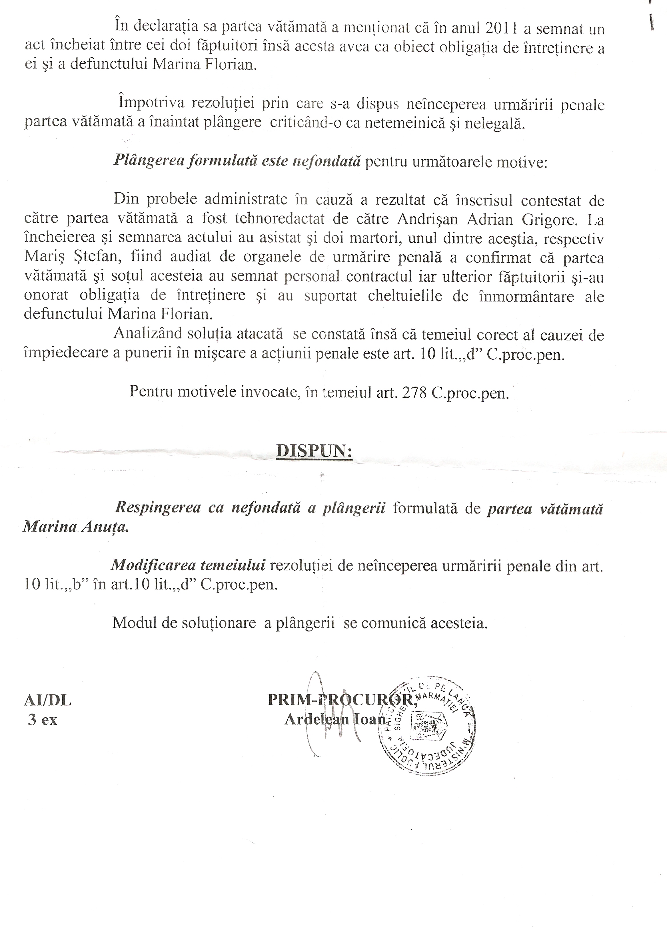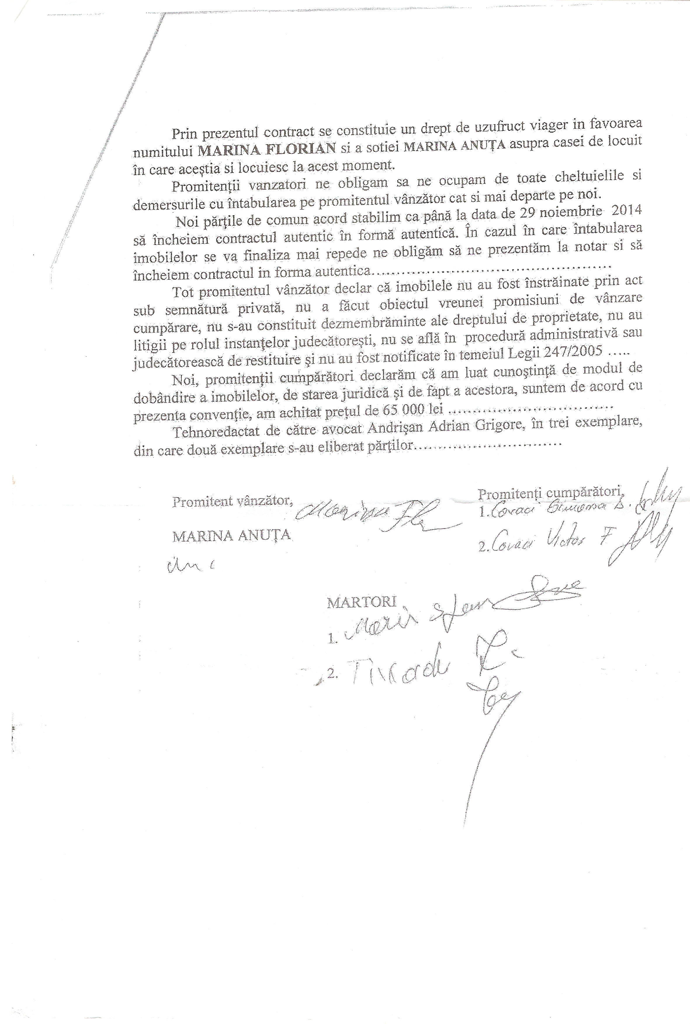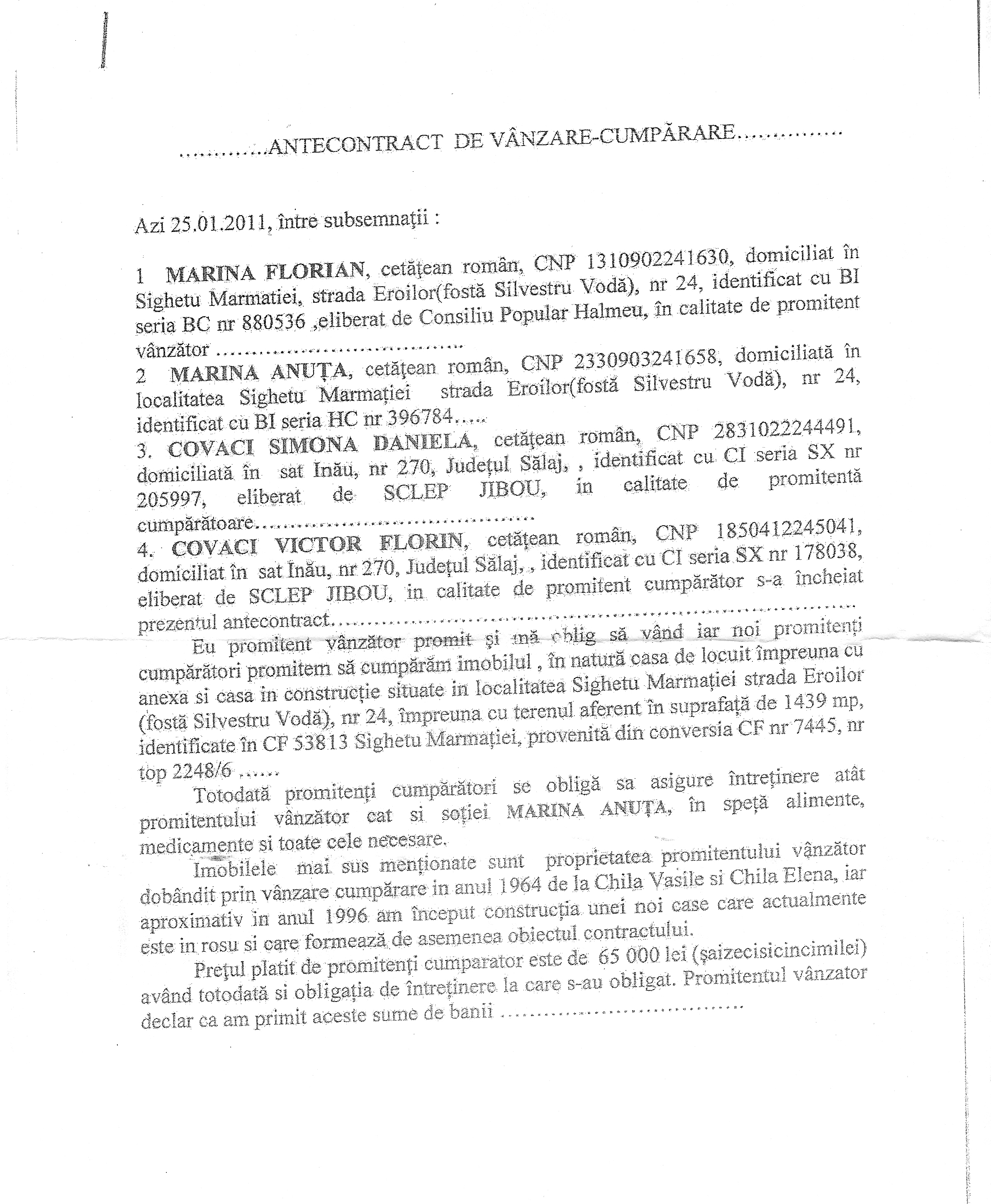 Intruna din zile o nepoată de verişoară împreună cu soţul mai tuciuriu se oferă să le sprijine bătrâneţile el recomandându-se teolog iar ea asistentă medicală. Teologul însă nu avea parohie şi lucra în construcţii cu ziua, iar ea,... mai făcea specula peste pod la ucraineni. Zi de zi erau după bani împrumut la bătrîni pe care parţial îi restituiau dar de cele mai multe ori uitau de datorii. Mai mult stând în chirie solicită noilor rude să le permită să locuiască într-o bucătărie de vară aşa cum au mai toţi gospodarii ce locuiesc în suburbia Sighetului. Cum necum tinerii nepoţi prin alianţă întocmesc o promisiune de vânzare în contul întreţinerii celor doi bătrâni atunci când va fi cazul. Pentru a garanta cele promise atrag la contractul de promisiune nişte vecini în calitate de martori care aud şi iscălesc promisiunile fără a şti că în contract nepoţii trecuseră 65 de milioane de lei vechi ca şi avans în contul promisiunii de contract ,pe care însă martorii nu i-au văzut cum nici proprietarii de drept nu i-au primit pentru că nepoţii nu aveau nici după ce bea apă. Trece vremea , nepoţii numai trec să vadă sau să ajute spiritual (că material ,...vai de mama lor)pe cei doi bătrîni uniţi în faţa Legii şi a lui Dumnezeu cu acte în regulă. O boală cruntă seceră rapid viaţa soţului şi la mormântare apar şi nepoata cu soţul preot , ce are de grijă să ridice ajutorul de deces şi să pornească un proces prin care solicita respectarea promisiunii de contract. Dar cum fiecare are îngerul său doamna nu a semnat contractul acela niciodată iar semnătura soţului nu era cea care apărea pe actele de bancă . Apăruse un altfel de contract de data aceasta prin care văduva era somată să părăsească locuinţa, în caz contrar riscând evacuarea. Încep procesele ,intervin avocaţii,şi văduva arată şi depune plângere la organele de poliţie şi Parchet prin care sesizează deranjul în posesie , uzul de fals în înscrisuri. Poliţistul verifică de mântuială probele şi nu cere trimiterea în judecată a falsificatorilor. Procurorul de caz ,care este femeie uită să ceară proba grafologică chiar dacă aceasta a fost solicitată pe cheltuiala reclamantei. La rândul dumneaei dă vestitul NUP şi rămâne cum povestit ...în gară. Nemulţumită de rezoluţia Parchetului , victima reclamă, contestă rezoluţia la procurorul şef de pe judecătoria municipiului în să acesta susţine că nu are fondurile necesare pentru a cere expertize grafologice în contextul în care vezi Doamne actul în cauză este redactat de un avocat de la judeţ şi martorii credibili. Aşa că bătrîna doamnă bucătăreasă la cei 80 de ani împliniţi aşteaptă ca NEDREPTATEA , FALSUL, UZUL DE FALS ŞI COMPLICITATEA ORGANELOR, DE A NU UTILIZA TOATE METODELE PENTRU STABILI ADEVĂRUL PRIN METODE JUDICIARE să fie publicate şi aduse la cunoştinţa publicului larg din Sighetul Marmaţiei. Doamna în cauză se numeşte Marina Anuţa, locuieşte în Sighetu Marmaţiei strada Eroilor nr 24. Defunctul se numea Marina Florian. Cumpărătorii de bună credinţă se numesc Covaci Victor Florin domiciliat în sat Inău nr.270 judeţul Sălaj şi soţia Covaci Simona Daniela cu acelaşi domiciliu. Fireşte că în contract se aminteşte şi uzul fruct viager iar termenul de întabulare a imobilului din CF53813 provenit din conversia CF nr 7445 nr. Top 2248/6 este 29 noiembrie 2014. Pentru a fi omenoşi în acte promitenţii cumpărători se obligă să asigure întreţinere promitentului vânzător ,atât lui cât şi soţiei Marina Anuţa. Numai că promitenţii cumpărători nu şi-au respectat cuvântul ,redactat de un avocat iar promisiunea de contract de nu afost semnată de către soţia ,promitentului vânzător, actualmente văduva Marina Anuţa , care fapt aduce nulitatea actului .Justiţia oarbă nu a văzut sau nu a vrut să vadă actele şi să constate că de fapt , în speţă este un caz banal de înşelăciune cu concurenţa unui martor din promisiunea de contract.