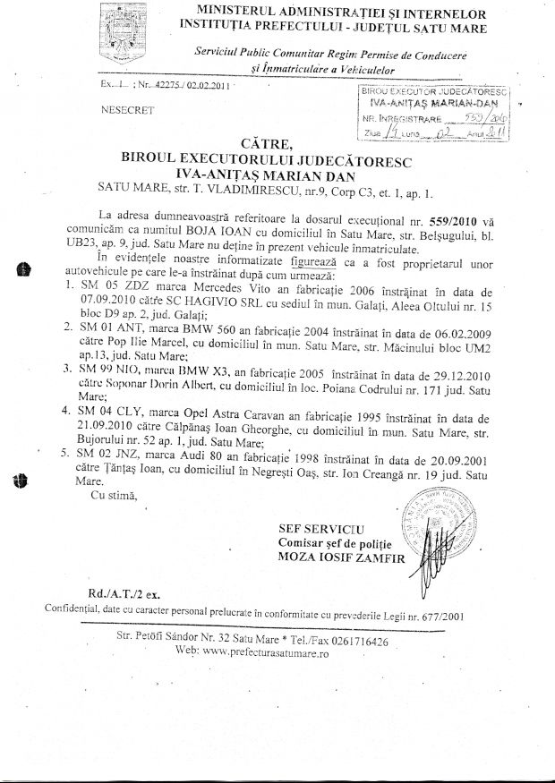 Cum asta e un aspect DEJA adus la cunostinta celor in masura sa bata cu pumnul in masa si sa imprastie aceasta clica, NOI va atasam prezentelor randuri numai documentul cu nr 42.275/02.02.2011, semnat de comisarul sef de politie Zamfir Iosif Moza si emis de Serviciul Public Comunitar Regim Permise de Conducere si Inmatriculare a Vehiculelor din cadrul Prefecturii Satu Mare.