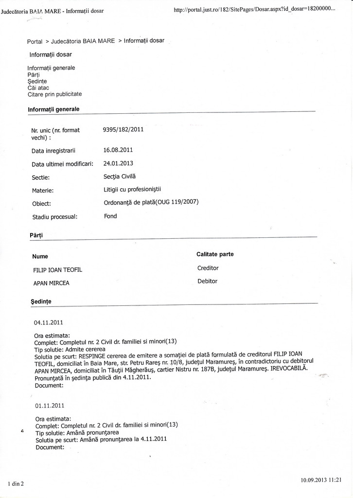 Vezi demersul lui impotriva lui Apan Mircea, cand in dosarul cu nr 9395/182/2011, in data de 24.01.2013, in acest dosar avand ca obiect „Ordonanta de plata”, conform OUG 119/2007, lui teo i s-a respins Cererea de emiterea somatiei de plata impotriva „debitorului” Apan Mircea.