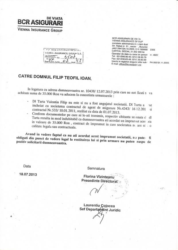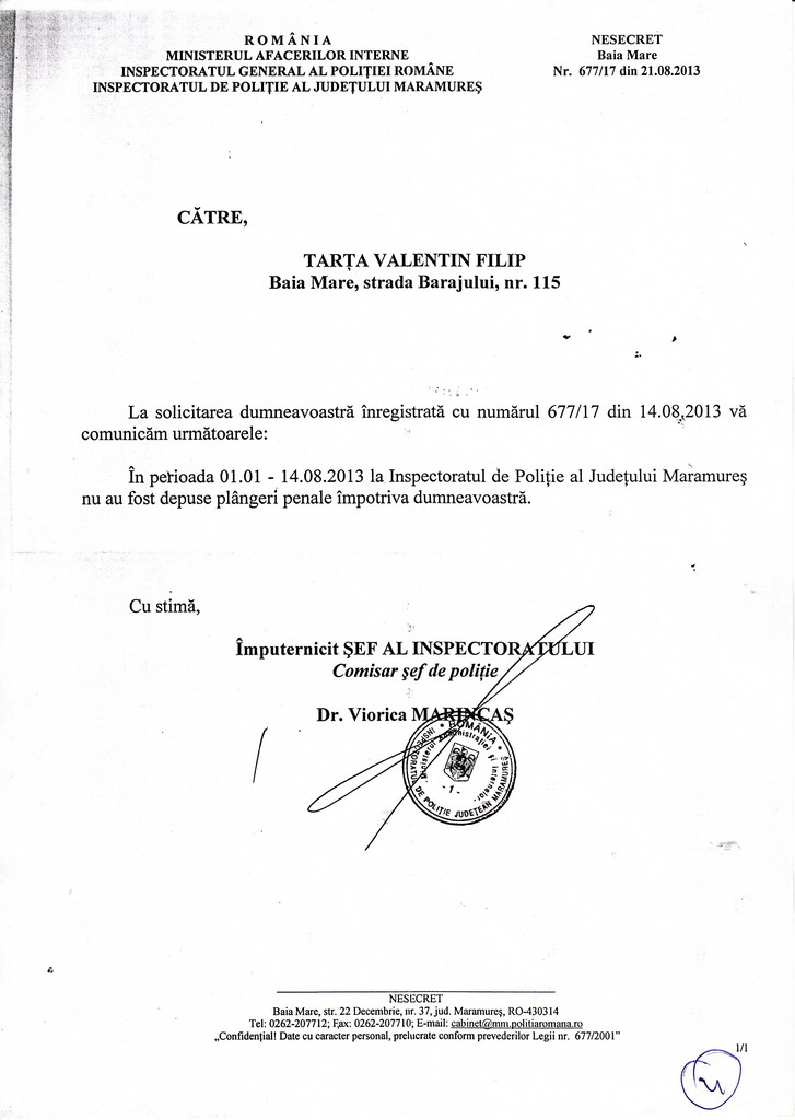 De asemenea, acelasi lucru rezulta si din adresa nr. 677/17 din 21 august 2013, o adresa semnata de dr. Viorica Marincas, comisar sef de politie, imputernicit Sef al IPJ Maramures.