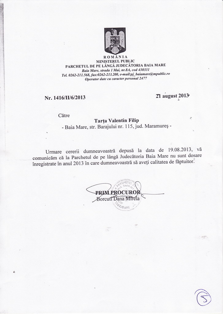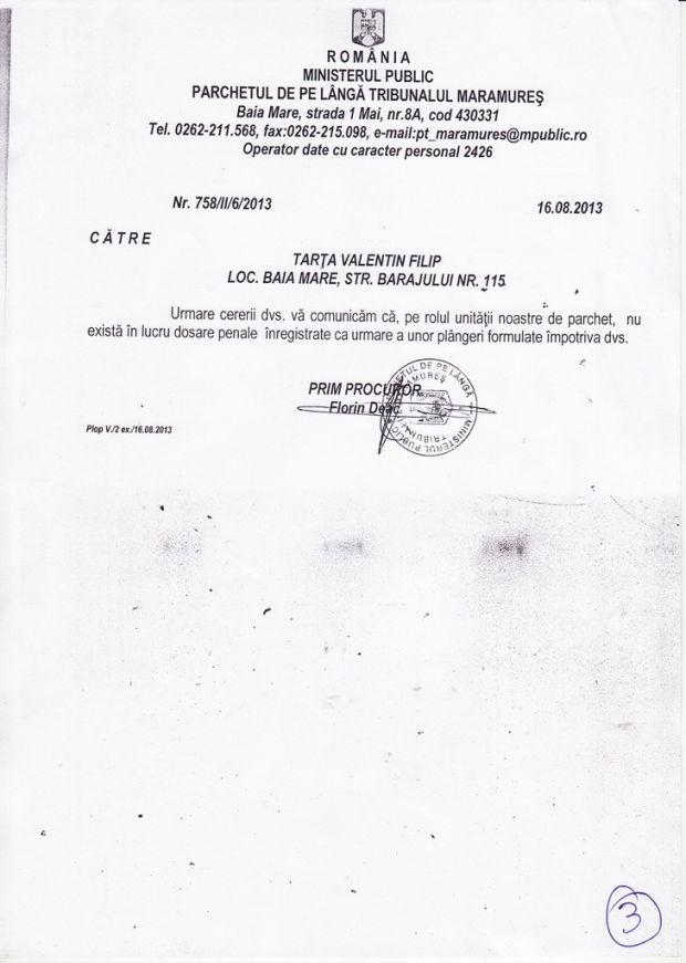 Acelasi lucru rezulta si din adresa 758/II/6/2013 din data de 16 august 2013, adresa semnata de prim procurorul Florin Deac de la Parchetul de pe langa Tribunalul Maramures.
