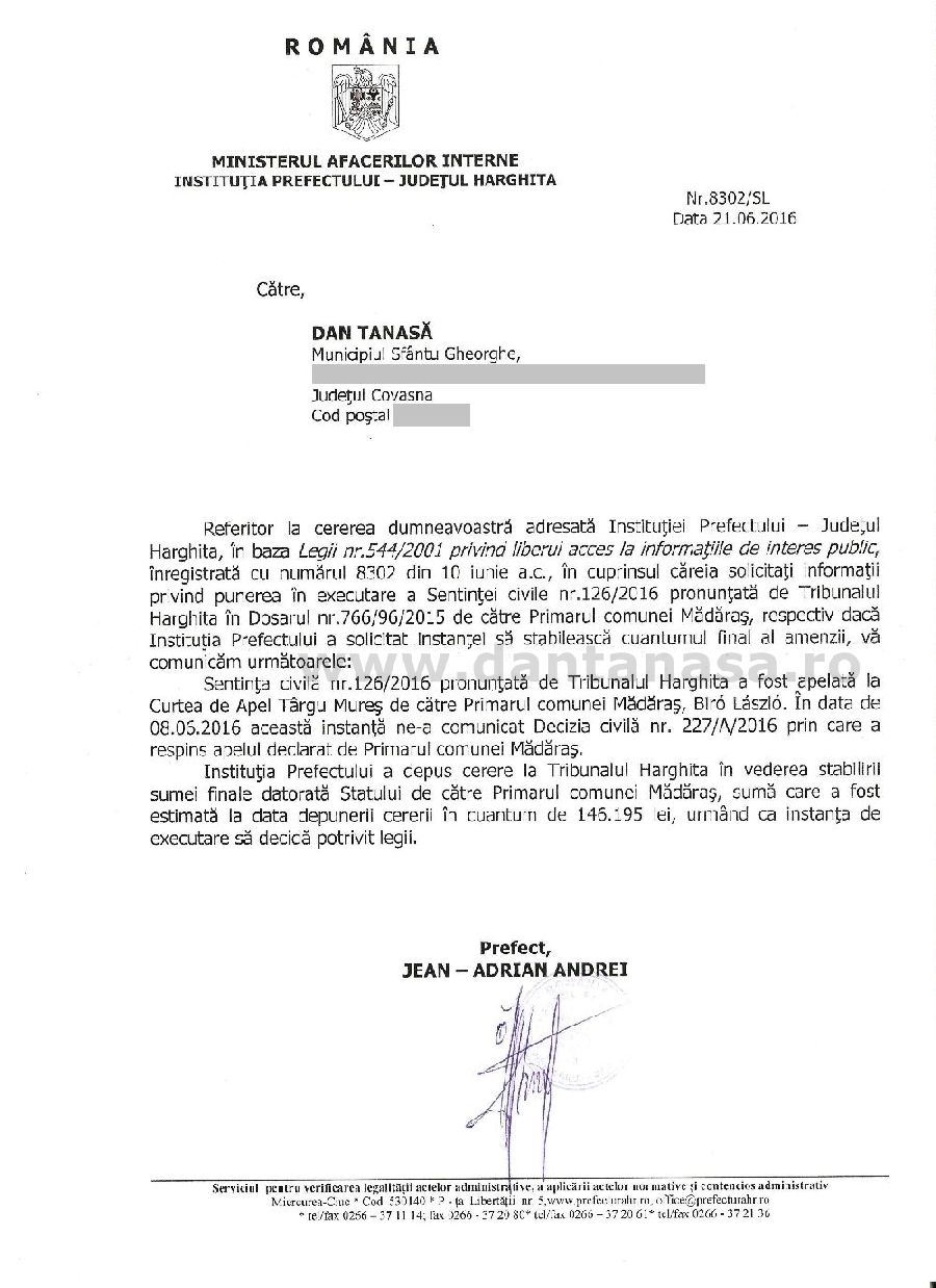 Prefectul județului Harghita a confirmat în luna martie a.c. redacției Informația Harghitei faptul că amenda va fi plătită de primarul UDMR din buzunarul său, nu din fondurile publice.