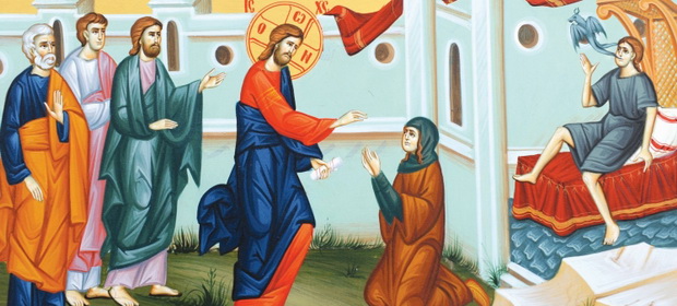 În vremea aceea a venit Iisus în părțile Tirului și ale Sidonului. Și, iată, o femeie cananeeancă, din acele ținuturi, ieșind striga, zicând: Miluiește-mă, Doamne, Fiul lui David! Fiica mea este rău chinuită de diavol. Iisus însă nu i-a răspuns nici un cuvânt; și, apropiindu-se, ucenicii Lui Îl rugau, zicând: Dă-i drumul, că strigă în urma noastră. Iar El, răspunzând, a zis: Nu sunt trimis decât către oile cele pierdute ale casei lui Israel. Iar ea, venind, s-a închinat Lui, zicând: Doamne, ajută-mă! El însă, răspunzând, i-a zis: Nu este bine să iei pâinea copiilor și s-o arunci câinilor. Dar ea a zis: Da, Doamne, dar și câinii mănâncă din fărâmiturile ce cad de la masa stăpânilor lor. Atunci, răspunzând, Iisus i-a zis: O, femeie, mare este credința ta; fie ție după cum voiești! Și s-a tămăduit fiica ei din ceasul acela.