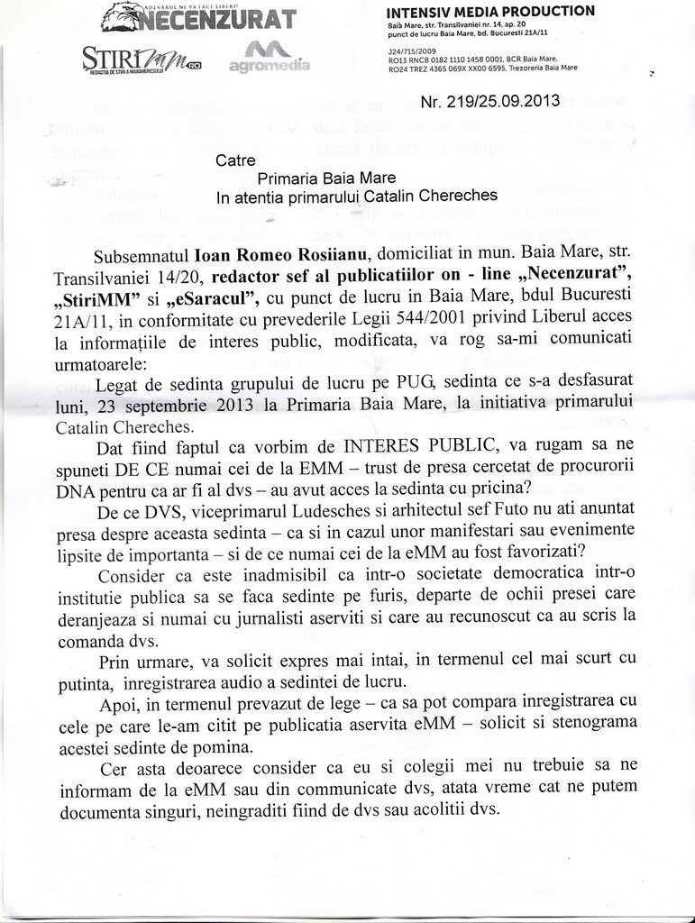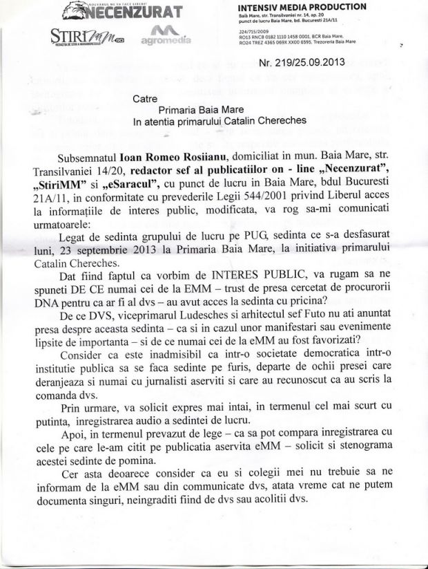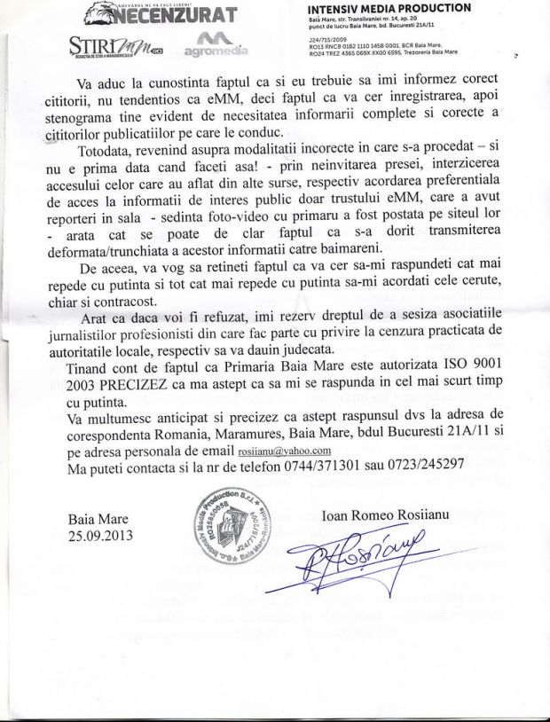 Am aratat modalitatea incorecta in care s-a procedat, prin neinvitarea presei, interzicerea accesului celor care au aflat din alte surse, respectiv acordarea preferentiala de acces la informatii de interes public doar trustului eMM, care a avut reporteri in sala (sedinta foto-video cu primarul) fapt care poate conduce la ideea ca s-a dorit transmiterea deformata/trunchiata a acestor informatii catre baimareni.