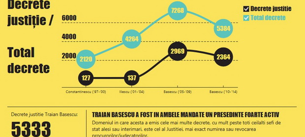 Dupa cei 10 ani de mandat, constatam cat de mult a transformat Basescu functia prezidentiala, devenind un actor foarte implicat in ceea ce priveste numirile din justitie. Traian Basescu a emis peste 5000 de decrete de schimbari de procurori si judecatori, cu o medie de cca 44 de decrete pe luna! Cu aceste schimbari, Traian Basescu devine direct asociat cu evolutia acestui sistem de justitie din ultimii 10 ani.