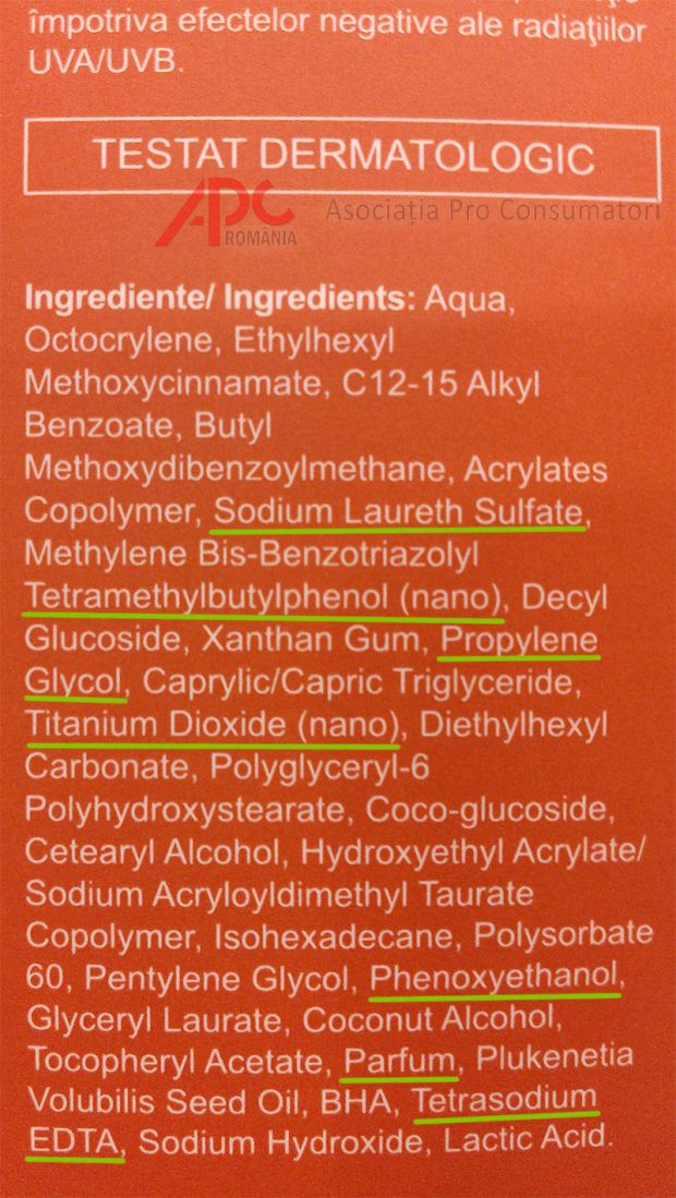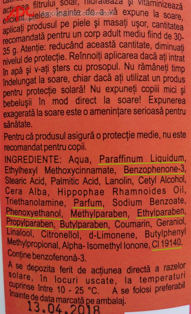„Din păcate, alegerea unei creme de protecție solară pentru copii, de către cei mai mulți părinți, se face având în vedere doar prețul și reclama făcută produsului respectiv pe posturile de televiziune. Cei care procedează în acest mod nu fac altceva decât să-și expună în mod constant copiii unor combinații de substanțe chimice care pe termen mediu vor genera afecțiuni medicale pentru a căror tratare/ameliorare se vor cheltui sume mari de bani. De aceea, pentru a nu pune în pericol viața copiilor voștri, vă recomand să NU cumpărați acele creme care conțin parabeni/conservanți, alcool etilic, ftalați, formaldehyde, silicon, nanoparticule de silică, nanoparticule de dioxid de titan, nanoparticule de tetramethylbutylphenol, coloranți sintetici, sodium lauryl sulfate (SLS), polietilen glicol (PEG-uri), fenoxietanol, uleiuri minerale, benzophenone-3, nickel, alergeni cunoscuți, parafine, parfum sintetic. Având în vedere compoziția chimică a unor astfel de produse, ne exprimăm temerea în legătură cu potențialul cancerigen, mutagen sau toxic al unor ingrediente, care creează o lipsă de siguranță pentru consumatori. Dacă luăm în calcul denumirea „parfum” acesta poate avea peste 200 de ingrediente în compoziția lui. Cele mai multe produse indică doar cuvântul parfum în lista ingredientelor. Câteva dintre problemele pe care le cauzează aceste parfumuri sunt: migrenele, amețeală, iritații ale pielii, hiperpigmentare, tuse violentă, vomă. Acesta este motivul pentru care sfătuim consumatorii să evite produsele destinate copiilor care conțin parfumuri și facem un apel către instituțiile statului să verifice modul în care producătorii respectă legislația în vigoare. Faptul că suntem atenționați de către unii producători asupra acestui lucru, dovedește că unele ingrediente din compoziția chimică a acestor produse pot provoca anumite afecțiuni medicale copiilor voștri. Având în vedere că în acest tip de produs predomină ingredientele de natură chimică, consumatorii trebuie să se informeze în prealabil la medicul pediatru/dermatolog. Totodată, vă recomand să nu cumpărați acele creme de protecție solară care nu au informații suficiente/clare referitoare la data de expirare și al căror tub nu prezintă un sigiliu, care, de fapt, oferă siguranță în privința necontaminării conținutului produsului respectiv. Termenul de valabilitate al produsului trebuie întotdeauna să fie un criteriu important în alegerea produsului. Nu vă lăsați păcăliți de anumite mențiuni, cum ar fi: cea mai bună cremă pentru copii, dezvoltată împreună cu medicii pediatri, recomandări ale asociațiilor profesionale etc, care apar pe ambalajul unor creme și uleiuri de protecție solară, acestea sunt folosite numai în scop de marketing pentru a vă convinge să cumpărați acele produse.” Conf. univ. dr. Costel Stanciu, președinte Asociația Pro Consumatori.