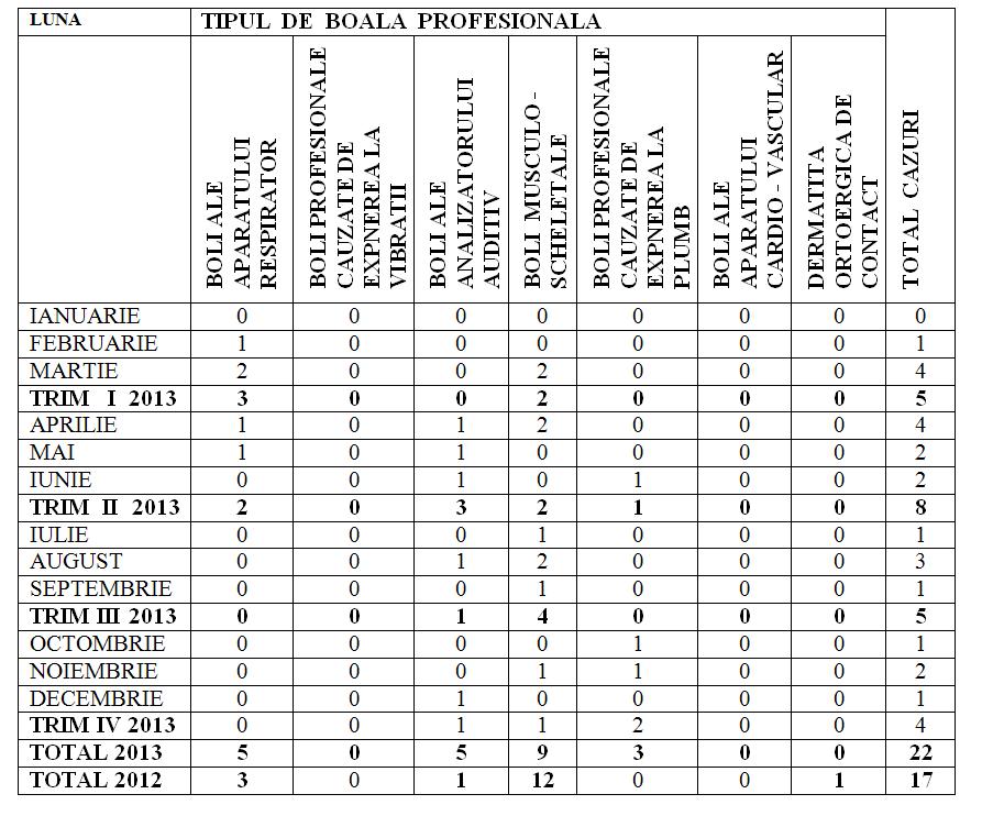 Situatia bolilor profesionale inregistrate in cursul anului 2013 , in urma cercetarii cazurilor semnalate este urmatoarea :