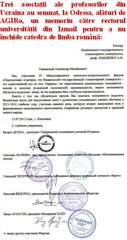 În vara lui 2013, la Odessa, ca expresie a solidarităţii pentru dreptul tinerei generaţii de a-şi învăţa limba maternă, cele patru asociaţii au semnat un memoriu comun (ataşat mai jos) pentru nu se închide specialitatea de limbă română din cadrul catedrei de limbi romanice de la Universitatea Umanistă de Stat din Ismail. Celor patru asociaţii li s-au alăturat prin semnătura lor încă două asociaţii: