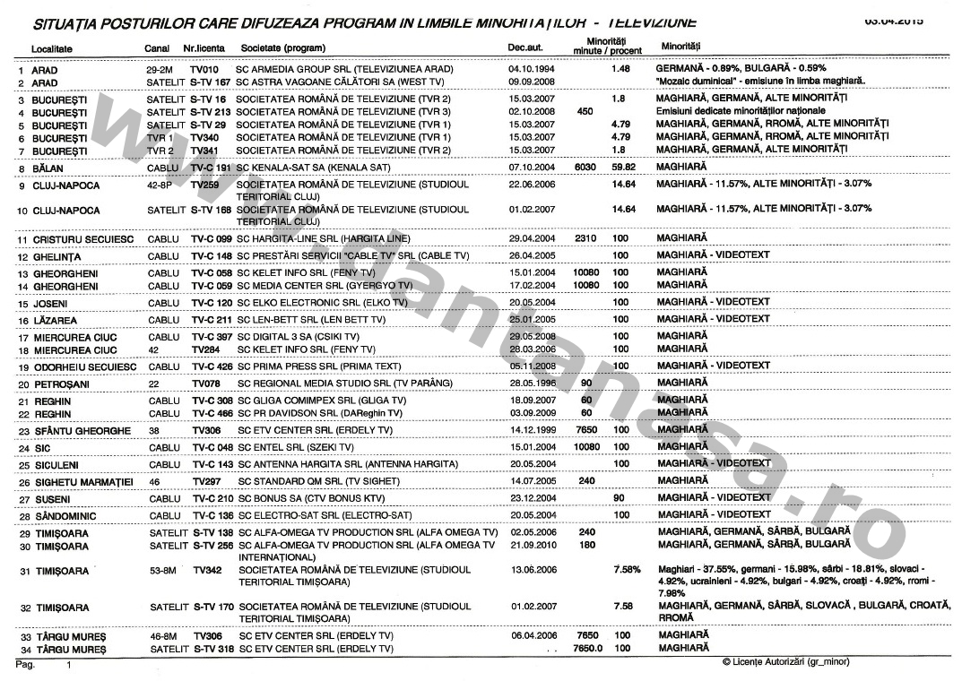 Potrivit unui document al CNA, pe teritoriul României sunt autorizate să emită în limba maghiară zeci de posturi TV și de radio locale. Atenție, este vorba de posturi TV și de radio înființate de firme din România după legislația audiovizuală din România.