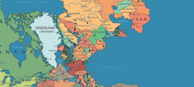 Pe hartă Marea Britanie nu mai este o insulă, ci are graniţe cu Franţa, Norvegia şi Irlanda. România ar fi avut graniţă doar cu Ungaria şi Ucraina şi Moldova şi ar fi avut ieşire în zona sud-estică la Oceanul Tethys (ocean din era Mezozoică).
