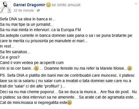 „Sefa DNA sa stea in banca ei…Sa nu mai tipe la un jurnalist…Sa nu mai minta in interviuri..ca la Europa FM. Sa astepte cuminte in banca domniei sale pana o sa i se puna bratarile pe care le merita cu prisosinta pe manutele ei mari”, a scris pe Facebook colonelul SRI în rezervă Daniel Dragomir, fost șef Grupare Sectoare informativ-Operative în Direcţia Generală de Prevenire şi Combatere Terorism din SRI, conform flux24.ro