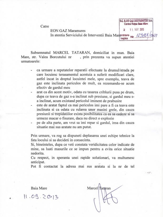 Dupa mai multe sesizari telefonice si la Primaria Baia Mare, dar si la EON Gaz Baia Mare, colegul nostru s-a decis sa treaca la un nou pas, anume acela al sesizarilor scrise.