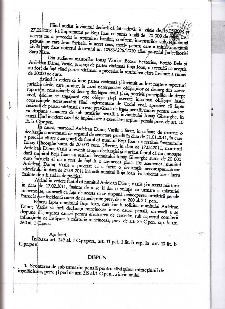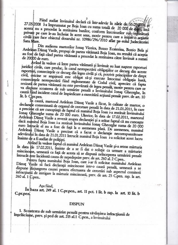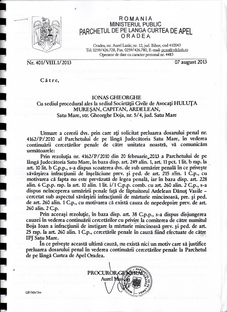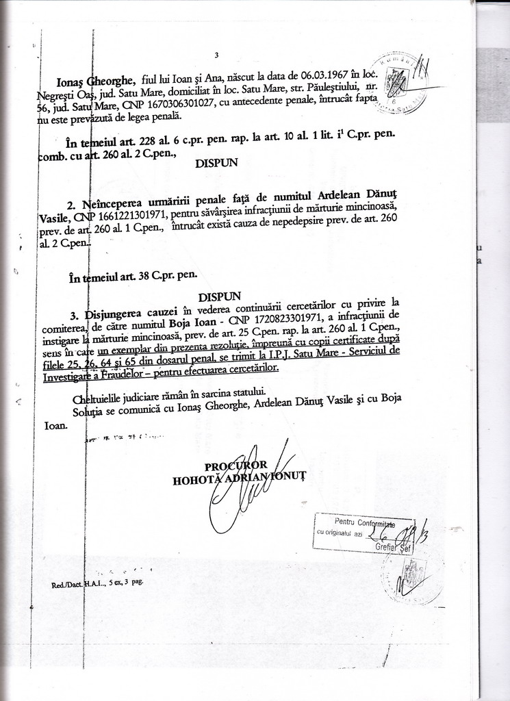 Si, ca urmare, procurorul Hohota Adrian Ionut a dispus inceperea urmaririi penale impotriva lui Boja Ioan pentru „instigare la marturie mincinoasa, prev. de art 25 Cod Penal, raportat la art 260 aliniatul 1 Cod penal”.