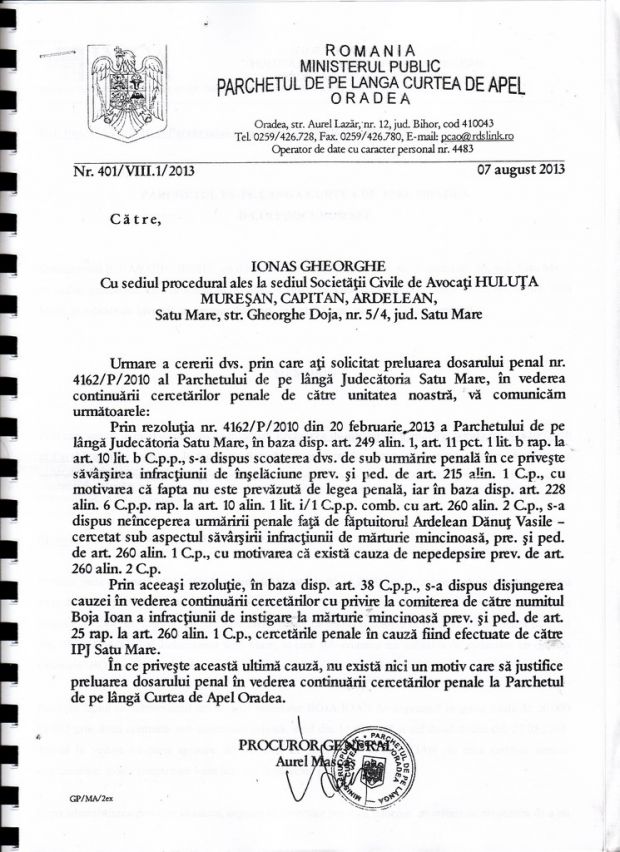 Faptul ca raspopitul este acum cercetat de politistii si procurorii satmareni este intarit si de adresa cu nr 401/VIII.1/2013, din data de 7 august 2013, data de procurorul general Aurel Mascas de la Parchetul de pe langa Curtea de Apel Oradea.