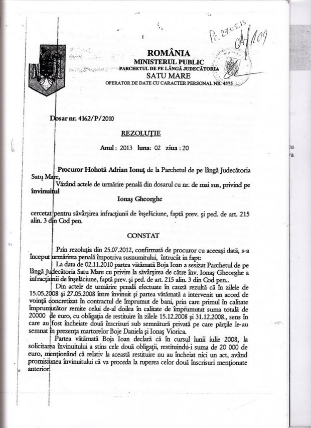 Ca prim argument in acest sens aducem Rezolutia data chiar de Parchetul de pe langa Judecatoria Satu Mare, recte Rezolutia din 20.02.2013, data in dosarul penal 4162/P/2010, acte existente si la paginile 109 – 111 in dosarul civil 10986/296/2010 de la - ati ghicit! – Sectia Civila a Judecatoriei Satu Mare.
