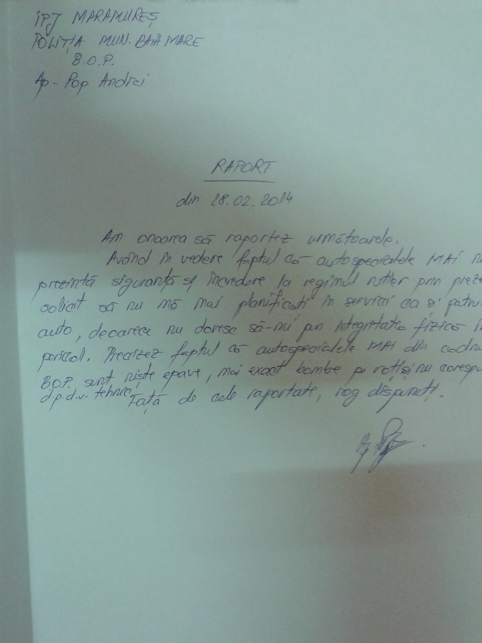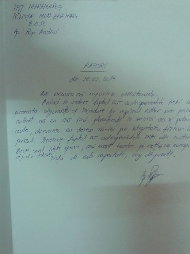 Mai exact, chiar in ultima zi a lunii februarie, printr-un explicit raport de serviciu, el le-a cerut sefilor ierarhici sa nu-l mai puna sa patruleze cu masina, aratand ca se teme atat pentru integritatea sa fizica, cat si pentru cea a cetatenilor pe care nu-I simte in siguranta cand el trece pe langa ei cu astfel de „jafuri”, dupa cum le numeste si denumeste el.