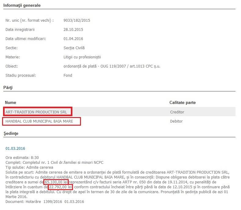 Astăzi la Judecătoria Baia Mare s-a judecat al doilea termen din dosarul în care ART TRADITION S.R.L. - firma lui Doru Dăncuș unul dintre principalii lideri ai ”Coaliției pentru Cacamaka”, cere executarea silită a HCM Baia Mare pentru suma de 87.892 lei (sold + penalități).