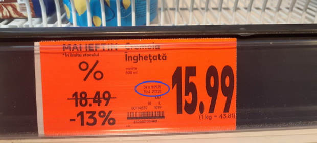 Astfel la marca arctic100 de îngheţată organică cu lapte de capră şi fistic, ambalata în caserolă de 500 ml şi fabricată în Olanda, Lot 164, preţul la raft era redus de la 37,49 lei la 29,99 lei, o reducere de 7,50 lei. La casa de marcat expertul APC a plătit pentru acest produs 37,49 lei, nicidecum 29,99 lei aşa cum ar fi fost corect!
