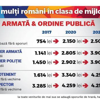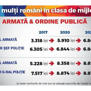 Și armata are salarii mari, în noua legea a salarizării unitare. Astfel, un colonel de armată va câștiga anul acesta 3.300 de lei, salariu care se va dubla până în 2020. Un comisar șef dd poliție va avea 6.300 de lei, un general de armată, 5.200 de lei și un chestor de poliție 7.500 de lei, anul acesta. Un colonel de armată va avea 3.300 de lei, salariul brut, un comisar de poliție, 6.300 de lei, un general de armată, 5.200 de lei, iar un chestor de poliție, 7.500 de lei. La acestea se adaugă sporurile de hrană și haine.