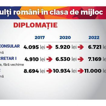 În diplomație, un atașat consular vqa avea anul acesta 4.000 de lei, un consul general, 4.900 de lei iar un ambasador, 8.600 de lei, urmând ca în 2020 să ajungă la 11.000 de lei.