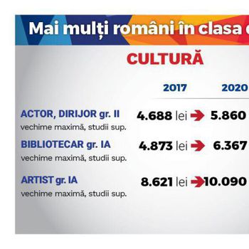 Interesante sunt salariile din cultură. Un actor va câștiga anul acesta 4.600 de lei, urmând ca venitul să ajungă în 2020 la aproape 7.000 de lei. Un blibiotecar va avea 4.800 de lei, în 2017, în timp ce un artist, cu vechime maximă, va câștiga 8.600 de lei. În 2020, un artist va ajunge să câștige 10.000 de lei.