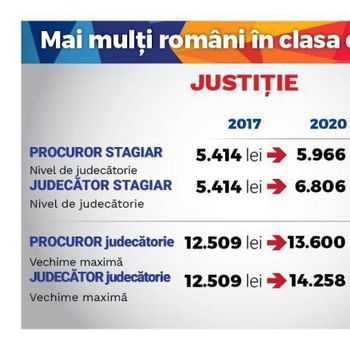 Salarii mari vor avea și cei din Justiție. Astfel, Un procuror stagiar și un judecător stagiar vor începe cu un salariu de 5.400 de leri, și vor ajunge în 2022 la 5.900 de lei. Un procuror de judecătorie va avea 12.500 de lei anul acesta dar în 2020 va ajunge la peste 13.000 de lei, lunar. Și judecătorii vor ajunge la salarii de peste 13.000 de lei, în 2020.
