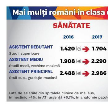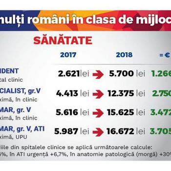 Legea salarizării unitare prevede că un medic rezident, în anul I, va avea anul acesta un salariu de 2.621 de lei, iar în 2018 va ajunge la 5.700 de lei, adică 1.266 de euro. Medicul specialist va începe cu un salariu de 4.400 de lei, dar va ajunge în 2018 la 12.300 de lei. Medicul primar va avea anul acesta 5.600 de lei, iar peste un an salariul său va ajunge la 12.300 de lei. Medicul primar va începe cu 5.900 de lei și peste un an va câștiga 16.600 de lei.