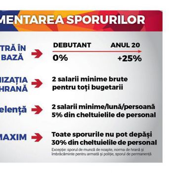 Vechimea în muncă va însemna, pentru 20 de ani de muncă, la 25% spor la salariu. În plus, se introduce indemnizația de hrană, în valoare de două salarii minime brute, pentru toți bugetarii. Aceștia vor primi și premii de excelență, reprezentând tot două salarii minime, pe lună, reprezentând 55 din cheltuielile cu personalul. Plafonul maxim al sporurilor nu pitea depăși 30% din cheltuielile cu personalul.